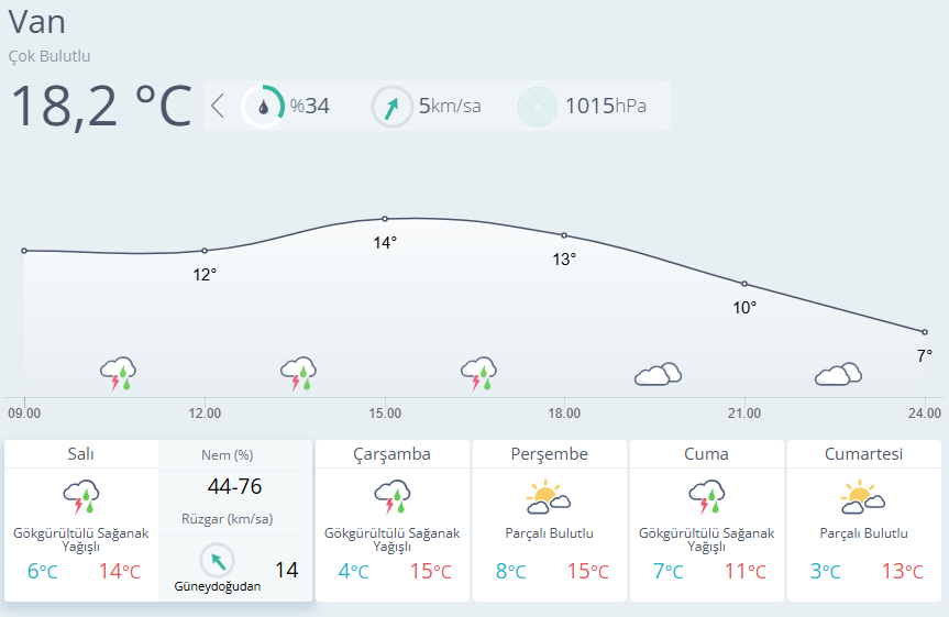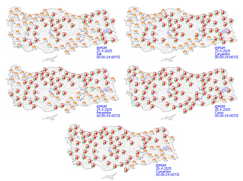 Meteorolojiden yapılan tahminlere göre: Ülke genelinde havanın parçalı yer yer çok bulutlu olması beklenirken İç Ege, Göller Yöresi, İç Anadolu’nun kuzey ve doğusu, Karadeniz’in iç kesimleri, Doğu Anadolu’nun doğusu ile Muğla, Giresun ve Siirt çevreleri, Aydın'ın güney ilçeleri ve Antalya'nın batı kesimlerinin aralıklı sağanak ve gök gürültülü sağanak yağışlı geçeceği tahmin ediliyor. Sabah ve gece saatlerinde Marmara'nın güneyi ile Karadeniz kıyılarında pus ve yer yer sis bekleniyor. Rüzgarın; Doğu Anadolu’nun doğusunda güney ve güneybatı yönlerden kuvvetli olarak (30-50 km/saat) esmesi bekleniyor. Hava sıcaklığının mevsim normalleri üzerinde seyretmekte olan hava sıcaklıklarının artmaya devam edeceği tahmin ediliyor. Kuvvetli rüzgâr uyarısı rüzgârın, Doğu Anadolu’nun doğusunda güney ve güneybatıdan kuvvetli (30-50 km/saat) esmesi beklendiğinden yaşanabilecek olumsuzluklara karşı dikkatli ve tedbirli olunması gerekmektedir.