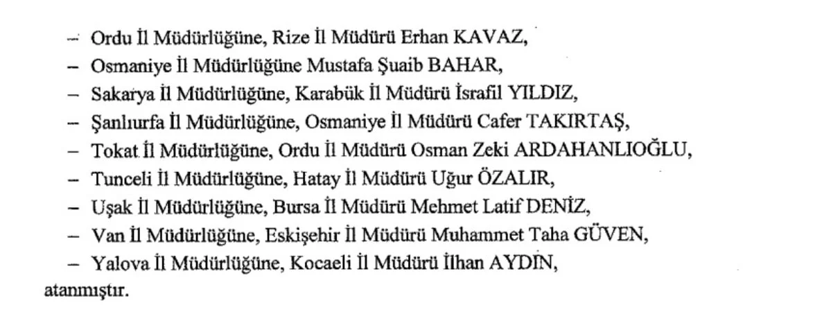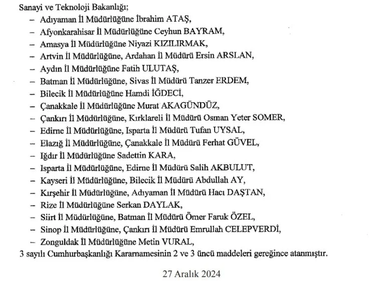Afyonkarahisar İl Müdürü Akın Yıldırım, Ankara İl Müdürü Muhammed Polat, Balıkesir İl Müdürü Mehmet Ali Aşuk görevden alınırken yerlerine yeni isimleri atadı. Cumhurbaşkanı Recep Tayyip Erdoğan'ın imzasıyla yayımlanan Resmi Gazete'de kararına göre; Van Sanayi ve Teknoloji İl Müdürlüğü'nde görev değişikliği yaşandı. Van Sanayi ve Teknoloji İl Müdürlüğüne Eskişehir Sanayi ve Teknoloji İl Müdürü Muhammed Taha Güven atandı.