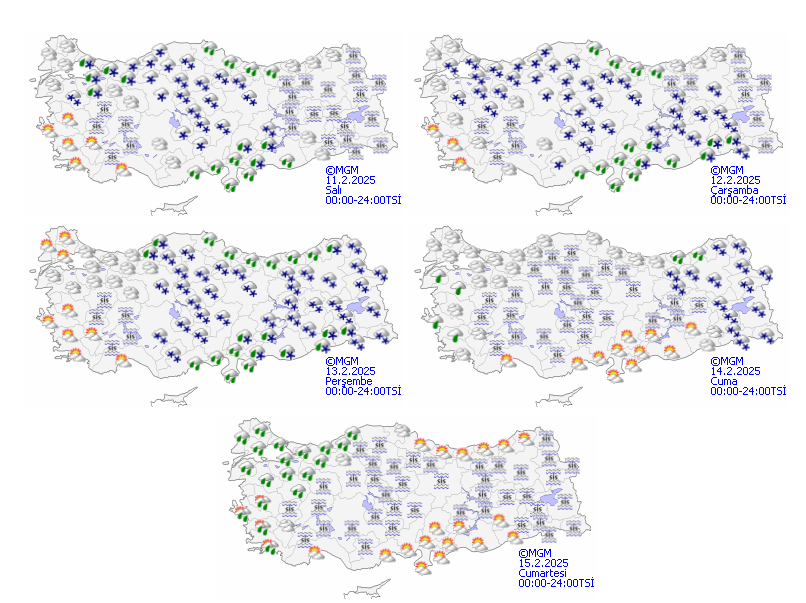 Meteorolojiden yapılan son hava tahminlerine göre; Ülke genelinin parçalı ve çok bulutlu, Marmara’nın doğusu, Doğu Akdeniz, İç Anadolu (Eskişehir hariç), Batı ve Orta Karadeniz, Doğu Karadeniz kıyıları, Doğu ve Güneydoğu Anadolu'nun batısı, Afyonkarahisar, Diyarbakır ve Mardin çevreleri, Çanakkale'nin, Tekirdağ'ın ve Kırklareli'nin doğu kesimleri ile Antalya’nın batı ve doğu kıyılarının yağışlı geçeceği tahmin ediliyor. Yağışların; Orta ve Doğu Karadeniz kıyıları, Akdeniz kıyıları ile Diyarbakır, Şanlıurfa ve Mardin çevrelerinde yağmur, yağış alan diğer yerlerde karla karışık yağmur ve kar şeklinde olması bekleniyor. İç ve doğu kesimlerde buzlanma ve don olayı ile birlikte pus ve yer yer sis görüleceği tahmin ediliyor. Doğu Karadeniz’in iç kesimlerinin yüksekleri ile Doğu Anadolu’nun yüksek ve dik yamaçlarında çığ tehlikesi bulunmaktadır. Hava sıcaklığında önemli bir değişiklik olmayacağı ve mevsim normallerinin altında seyretmeye devam edeceği tahmin ediliyor. Rüzgarın, genellikle kuzey yönlerden hafif, ara sıra orta kuvvette, Marmara'nın batısı ve Kıyı Ege'de kuvvetli (40-60 km/saat) olarak esmesi bekleniyor.