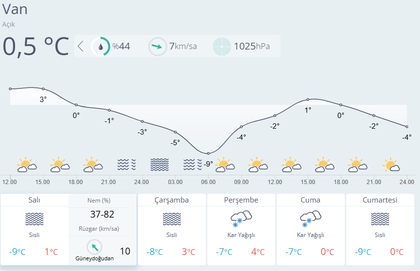 Meteoroloji Van’da beklenen kar yağışı için tarih verdi. Yapılan son hava tahminlerine göre Van’da bugün havanın aralıklarla kar yağışı beklenirken Çarşamba günü itibarıyla kar yağışının etkisini arttırması bekleniyor. Salı gününü sisli ve puslu geçirecek olan Van, Çarşamba, Perşembe ve Cuma günü kent genelinde etkisini arttırması bekleniyor. Hafta sonu ise Van’da sisli ve puslu bir hava bekleniyor.