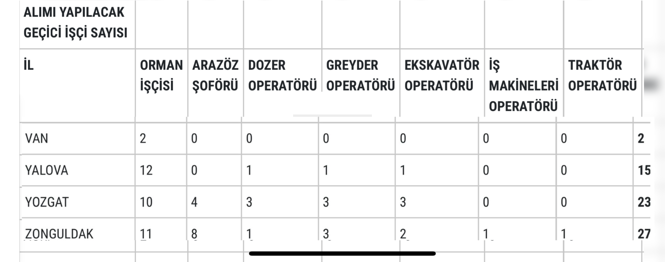 Yapılan açıklamada, “Kamu Kurum ve Kuruluşlarına İşçi Alınmasında Uygulanacak Usul ve Esaslar Hakkında Yönetmelik hükümleri uyarınca Genel Müdürlüğümüz taşra teşkilatında istihdam edilmek üzere Orman İşçisi pozisyonunda 3105, Arazöz Şoförü pozisyonunda 812, Dozer Operatörü pozisyonunda 160, Greyder Operatörü pozisyonunda 233, Ekskavatör Operatörü pozisyonunda 122, İş Makinesi Operatörü pozisyonunda 36 ve Traktör Operatörü pozisyonunda 32 olmak üzere toplamda 4500 geçici işçi alımı yapılacaktır.