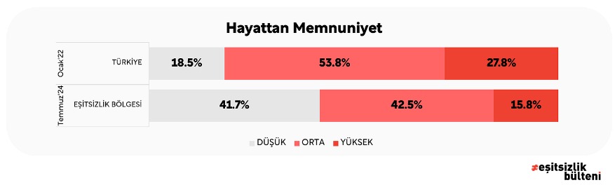 Hayattan memnuniyeti düşük olanların oranı Türkiye’de yüzde 18,6 olurken, Van’ın da içerisinde yer aldığı Eşitsizlik Bölgesi’nde ise bu oran yüzde 41,7. Hayattan memnuniyeti yüksek olanların oranı Türkiye’de yüzde 27,8 iken Van’ın da içerisinde yer aldığı Eşitsizlik Bölgesi’nde ise bu oran yüzde 15,8. Bu veriler, Türkiye geneli ve Eşitsizlik Bölgesi karşılaştırıldığında, hayattan memnuniyeti düşük ve yüksek olanlar arasında çarpıcı bir fark olduğunu gösteriyor.