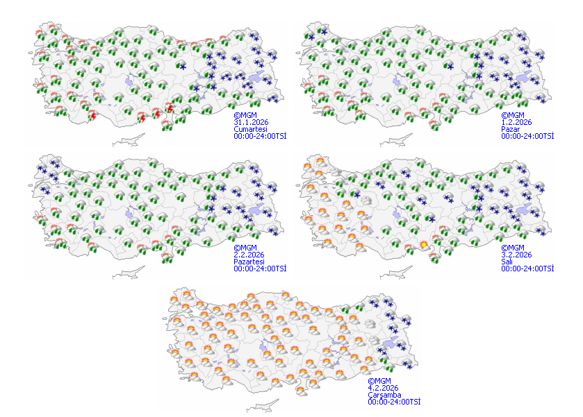Meteoroloji Genel Müdürlüğü olarak yapılan değerlendirmelere göre: Yurt genelinin çok bulutlu ve yağışlı geçeceği tahmin ediliyor. Genellikle yağmur ve sağanak, Kıyı Ege ile Akdeniz kıyılarında yer yer gök gürültülü sağanak, İç Ege'nin yüksekleri, İç Anadolu'nun kuzeydoğusu, Karadeniz'in iç kesimleri ve Doğu Anadolu'da karla karışık yağmur ve kar şeklinde görülmesi beklenen yağışların, Kıyı Ege, Akdeniz kıyıları, Güneydoğu Anadolu'nun batısı ile Çanakkale, Tekirdağ, Kahramanmaraş, Bingöl, Muş, Bitlis, Şırnak ve Hakkari çevrelerinde kuvvetli, Antalya'nın doğusu ile Hatay ve Osmaniye çevrelerinde yer yer çok kuvvetli olacağı tahmin ediliyor. Doğu bölgelerde buzlanma ve don olayı bekleniyor. Doğu Karadeniz’in iç kesimlerinin yüksekleri ile Doğu Anadolu’nun doğusunda yüksek kar örtüsüne sahip eğimli kesimlerinde çığ tehlikesi bulunmaktadır.