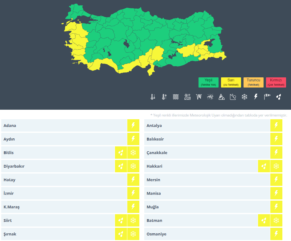 Meteoroloji tarafından Adana, Antalya, Aydın, Balıkesir, Batman, Bitlis, Çanakkale, Diyarbakır, Hakkari, Hatay, İzmir, Kahramanmaraş, Manisa, Mersin, Muğla, Osmaniye, Siirt ve Şırnak illerine sarı kodlu uyarı verildi.