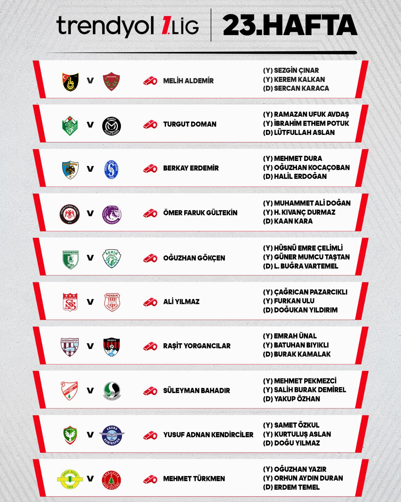 Trendyol 1. Lig'de 23. haftanın hakemleri belli oldu. pic.twitter.com/YaQakk2KMU