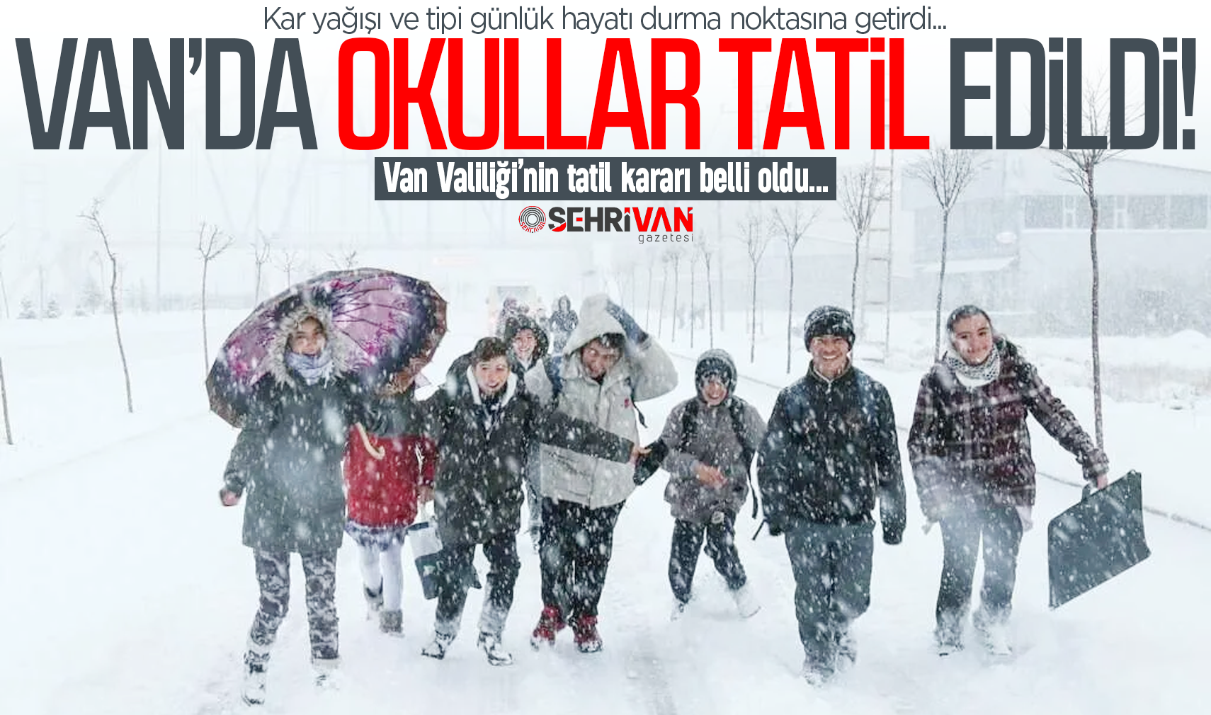 Van Valiliği il genelinde devam eden kar yağışı, tipi ve buzlanma nedeniyle 2 Ocak Cuma günü okulların 1 gün tatil edildiğini duyurdu.