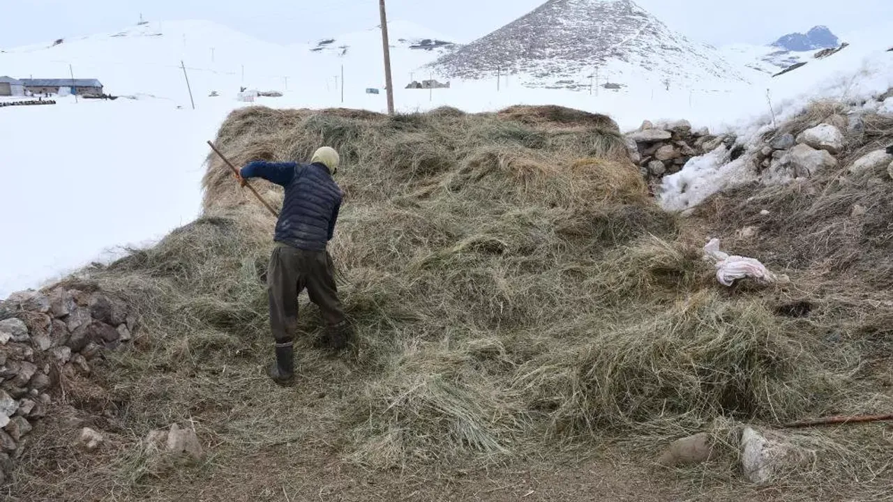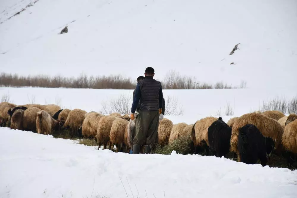 Kar kalınlığının 2 metreyi bulduğu yaylada sabah hayvanlarına yem vermek için saman taşıyıp karda seren Yacan, daha sonra koyun ve keçilerine yaptığı patika yoldan yürütüp sabah öğle ve akşam yemini veriyor.