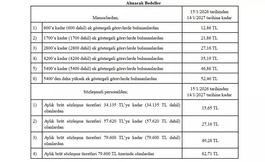 Sözleşmeli personelden aylık brüt sözleşme ücreti 34 bin 135 liraya kadar (bu tutar dahil) olanlardan günlük 15,65 lira, 57 bin 620 liraya kadar (57 bin 620 lira dahil) olanlardan günlük 27,16 lira, 79 bin 600 liraya kadar (79 bin 600 lira dahil) olanlardan günlük 49,28 lira ve 79 bin 600 liranın üzerinde olanlardan günlük 62,71 lira yemek bedeli alınacak.