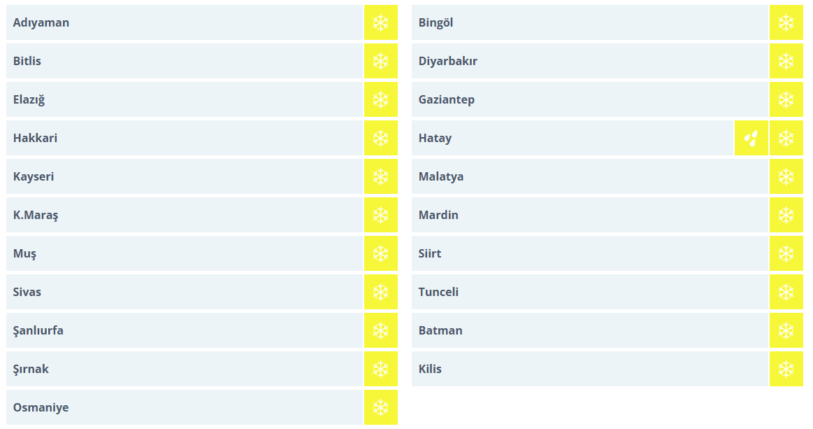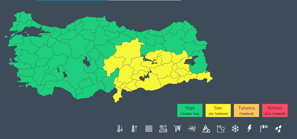 Uyarı yapılan iller arasında; Adıyaman, Bingöl, Bitlis, Diyarbakır, Elazığ, Gaziantep, Hakkari, Hatay, Kayseri, Malatya, Kahramanmaraş, Mardin, Muş, Siirt, Sivas, Tunceli, Şanlıurfa, Batman, Şırnak, Kilis, Osmaniye yer alıyor.