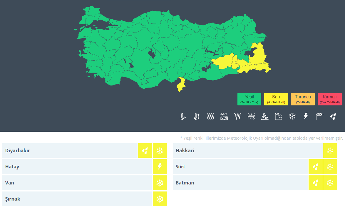 Yağışların, Osmaniye, Hatay, Ardahan, Bitlis, Hakkari, Şırnak, Diyarbakır, Batman ve Siirt çevreleri ile Artvin'in iç kesimlerinde yer yer kuvvetli olması beklendiğinden sel, su baskını, heyelan ve kuvvetli kar yağışlarının oluşturabileceği ulaşımda aksamalar gibi olumsuzluklara karşı dikkatli ve tedbirli olunması gerekmektedir.
