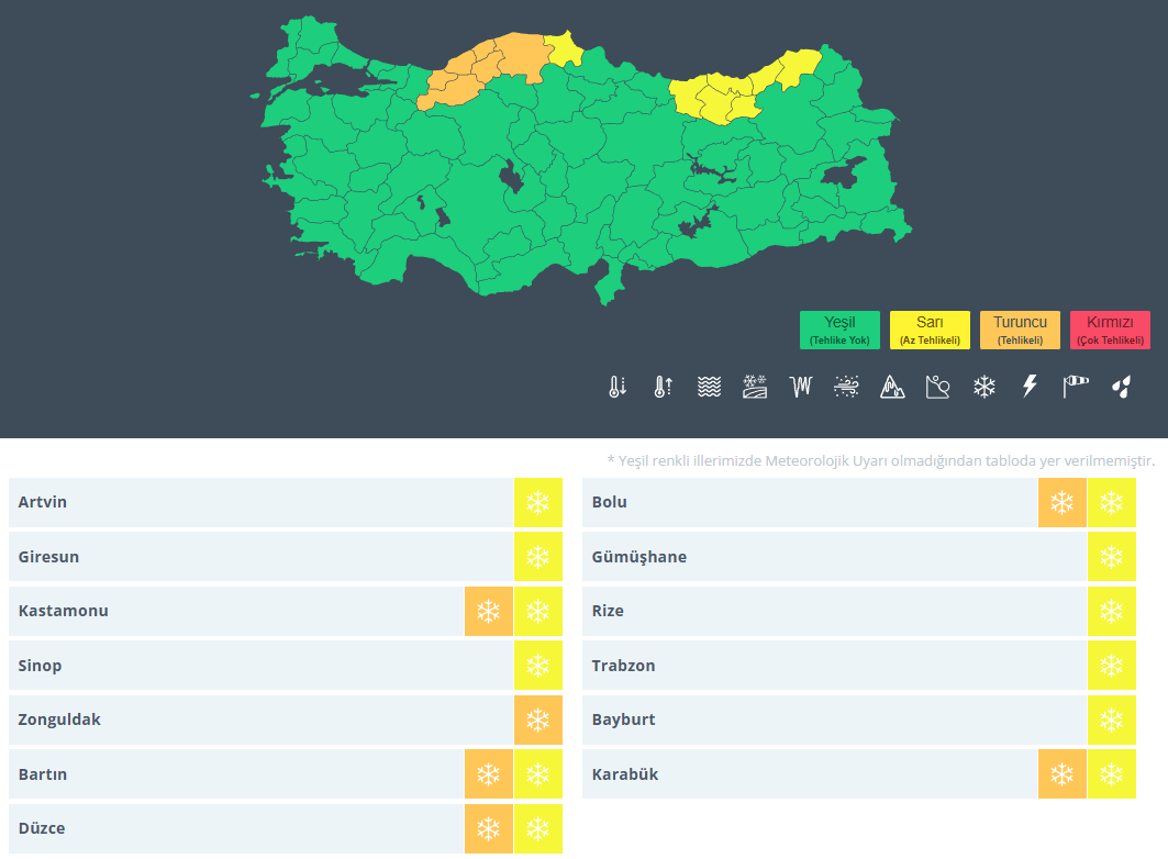 Artvin, Bayburt, Giresun, Gümüşhane, Rize, Sinop, Trabzon’a sarı kod uyarısı yapan Meteoroloji Bolu, Kastamonu, Zonguldak, Bartın, Düzce, Karabük’e ise turuncu kod uyarısı verdi.
