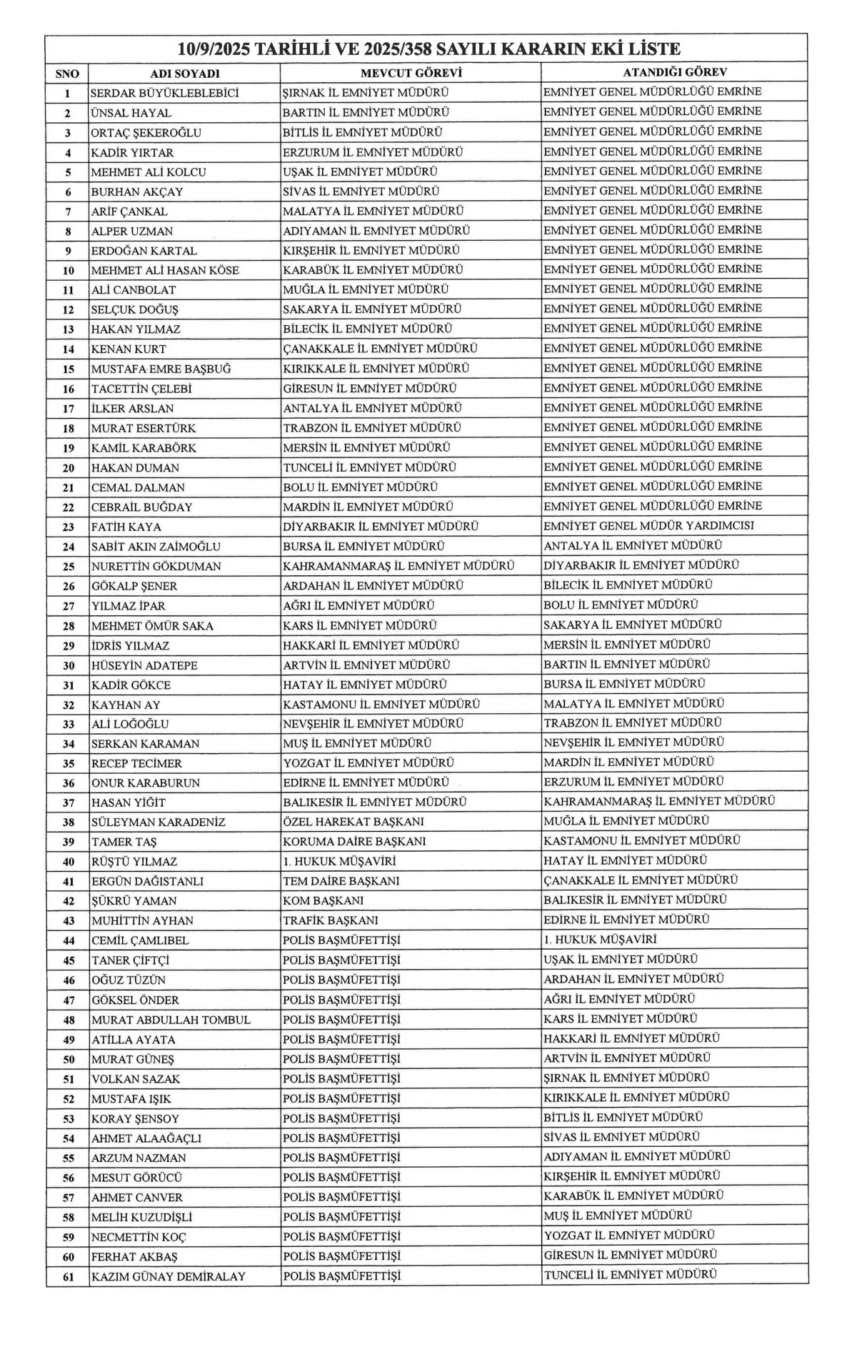 Cumhurbaşkanı Erdoğan’ın imzasıyla yayımlanan Resmi Gazete kararına göre; Emniyet Müdürlüklerinde dikkat çeken yeni atamalar yapıldı. Emniyet müdürleri kararnamesiyle 37 ile yeni Emniyet Müdürü atanırken 22 ilin İl Emniyet Müdürü ise merkeze çekildi.