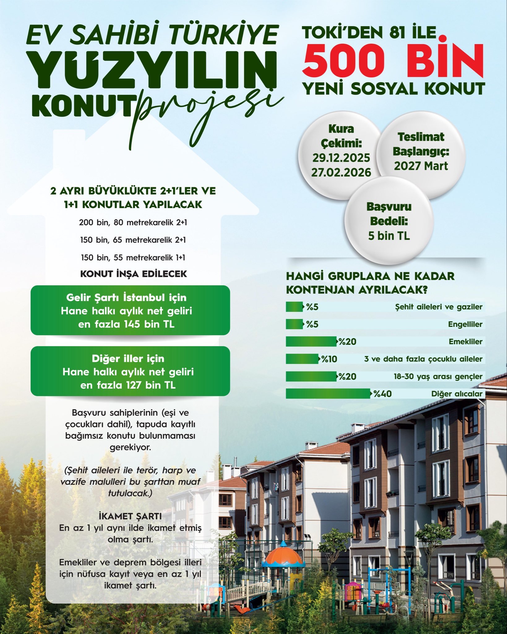 19 Aralık'ta başvuruların sona ermesi ile noter huzurunda çekiliş süreci başlayacak. Hak sahibi belirlemeleri için kura çekimi, 29 Aralık 2025 – 27 Şubat 2026 tarihleri arasında gerçekleştirilecek.