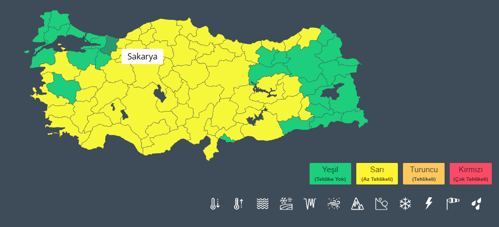 Meteoroloji Genel Müdürlüğü; Adana, Adıyaman, Afyonkarahisar, Amasya, Ankara, Antalya, Artvin, Aydın, Balıkesir, Bingöl, Bolu, Burdur, Çanakkale, Çankırı, Çorum, Denizli, Diyarbakır, Edirne, Elazığ, Eskişehir, Gaziantep, Giresun, Hatay, Isparta, Mersin, İzmir, Kastamonu, Kayseri, Kırklareli, Kırşehir, Konya, Kütahya, Malatya, Kahramanmaraş, Muğla, Nevşehir, Niğde, Ordu, Rize, Samsun, Sinop, Sivas, Tokat, Trabzon, Tunceli, Şanlıurfa, Uşak, Yozgat, Zonguldak, Aksaray, Karaman, Kırıkkale, Batman, Bartın, Karabük, Osmaniye, Düzce için sarı kodlu uyarıda bulundu.