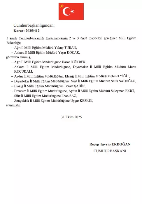 Cumhurbaşkanı Erdoğan tarafından yayımlanan Resmi Gazete kararına göre birçok kamu kurumunda yeni atamalar yapıldı. Resmi Gazete’de yayımlanan karara göre; 8 il Milli Eğitim Müdürü görevden alınarak yerlerine yeni isimler atandı. Cumhurbaşkanlığı tarafından yapılan atamalar hakkında karar Resmi Gazete'de yayımlandı.