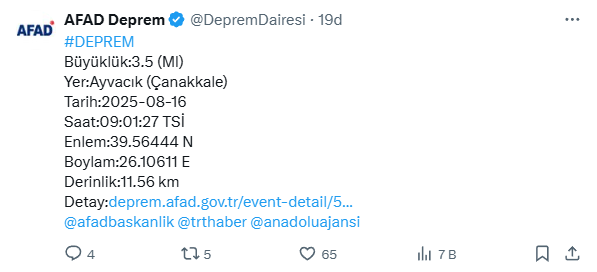 Afet ve Acil Durum Yönetimi Başkanlığı (AFAD), saat 09.01'de, merkez üssü Çanakkale'nin Ayvacık ilçesi olan 3.5 büyüklüğünde bir deprem meydana geldiğini duyurdu.
