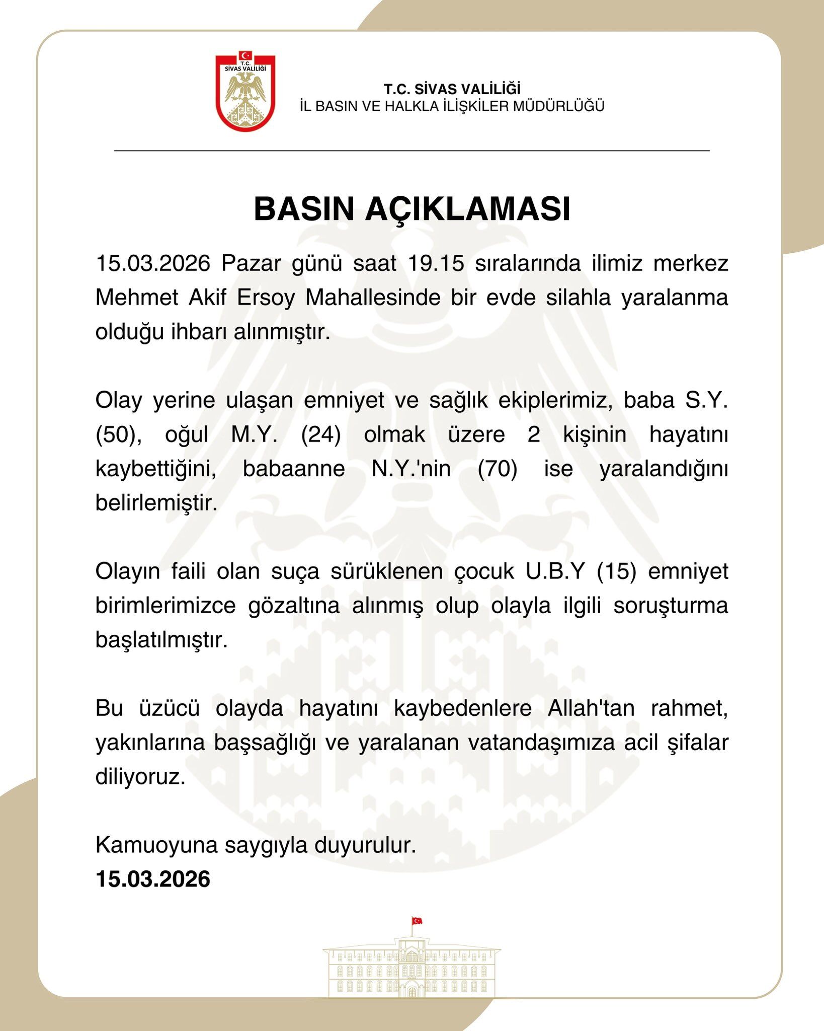 Valilikten yapılan yazılı açıklamada ise Mehmet Akif Ersoy Mahallesi'nde bir evde silahla yaralanma ihbarı üzerine olay yerine sağlık ve polis ekiplerinin sevk edildiği belirtildi. Ekiplerin olay yerinde yaptığı kontrolde baba S.Y. ile oğlu M.Y'nin hayatını kaybettiği, babaanne N.Y'nin ise yaralandığının tespit edildiği aktarılan açıklamada, "Olayın faili olan, suça sürüklenen çocuk U.B.Y. emniyet birimlerimizce gözaltına alınmış olup olayla ilgili soruşturma başlatılmıştır. Bu üzücü olayda hayatını kaybedenlere Allah'tan rahmet, yakınlarına başsağlığı ve yaralanan vatandaşımıza acil şifalar diliyoruz." ifadelerine yer verildi.