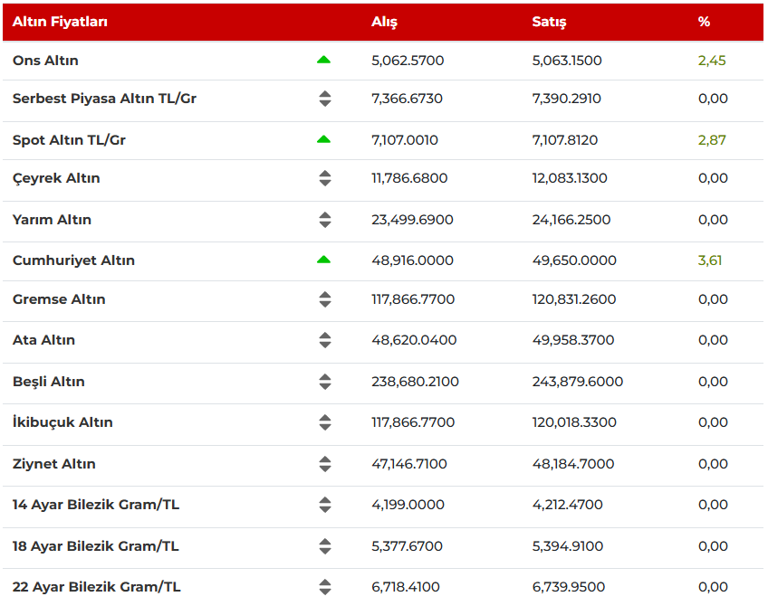 Rekor tazelemeye devam eden altın, haftanın ikinci gününde de yükselişini sürdürerek ons başına 5 bin doları aştı. Altının gramı 7 bin 107 TL seviyelerinde seyrederken, çeyrek altın 12 bin 83 liradan satışa sunuluyor. Yarım altın 24 bin 166 liradan alıcı bulurken, tam altın ise 48 bin 184 liradan işlem görüyor.