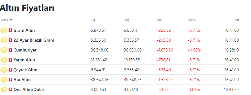 Dün yüzde 5,3 düşüşle 4 bin 125 dolardan kapanan altının ons fiyatı, Nisan 2013 yılından bu yana en hızlı düşüşünü kaydetti. Ons altın, saat 16.41 itibarıyla dünkü kapanışa göre yüzde 1.09 kayıpla 4 bin 81 dolardan alıcı buluyor.