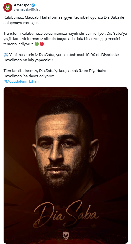 Amedspor transfer çalışmalarına hız kesmeden devam ediyor. Daha önce birçok iç ve dış transfer de önemli transferler yapan Yeşil-Kırmızılı ekip, son olarak İsrailli 32 yaşındaki tecrübeli orta saha oyuncu Dia Saba’yı kadrosuna kattı. Maccabi Haifa formasıyla UEFA Konferans Ligi'nde boy gösteren yeni transfer Dia Saba, bu sabah saat 10.00’da Diyarbakır Havalimanı’na iniş yapacak. Kulüp, tüm taraftarlarını havalimanına davet ederek yıldız oyuncuya coşkulu bir karşılama yapılması çağrısında bulundu.