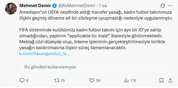“Amedspor’un UEFA nezdinde aldığı transfer yasağı, kadın futbol takımımıza ilişkin geçmiş döneme ait bir sözleşme uyuşmazlığı nedeniyle uygulanmıştır.