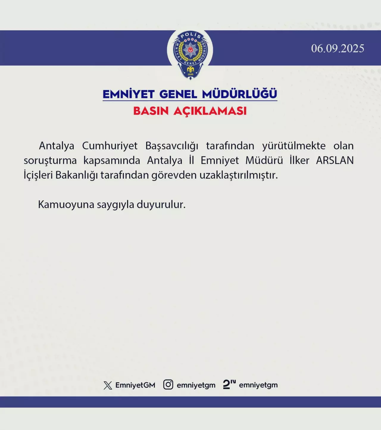 Emniyet Genel Müdürlüğü'nden yapılan açıklamada Antalya Cumhuriyet Başsavcılığı tarafından yürütülmekte olan soruşturma kapsamında Antalya İl Emniyet Müdürü İlker Arslan'ın İçişleri Bakanlığı'nca görevinden uzaklaştırıldığı açıklandı. Duyuru, İçişleri Bakanlığı'nın resmi sosyal medya hesaplarından da paylaşıldı.