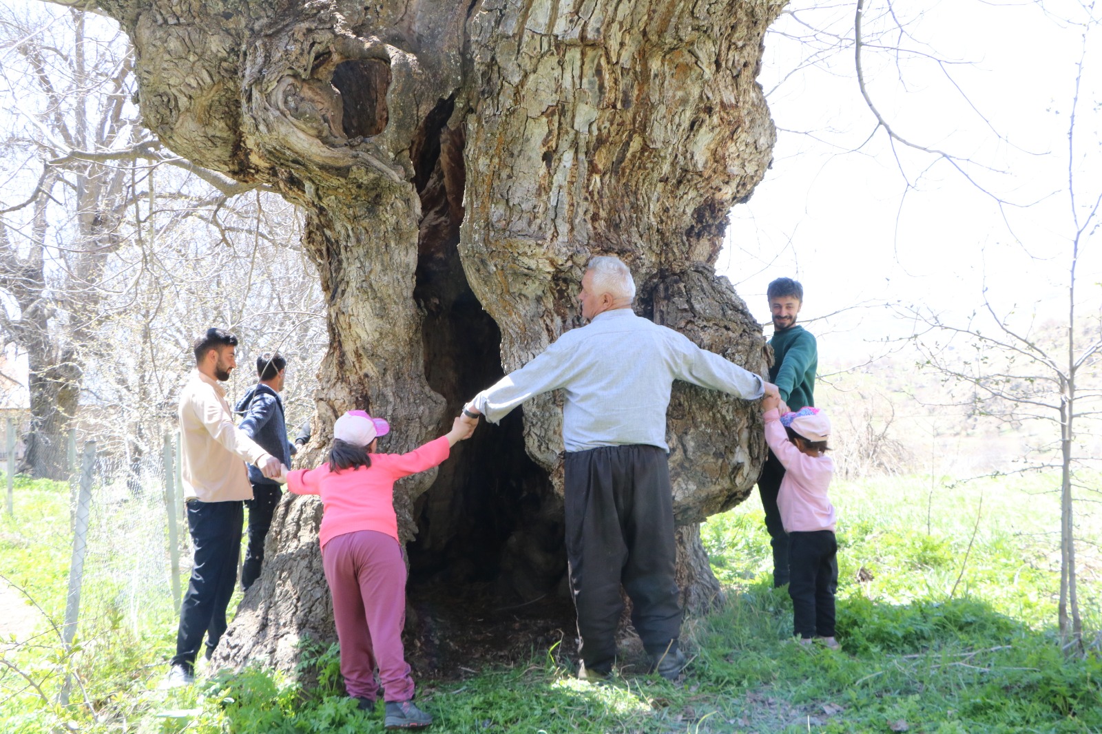 Ağacın çocukluğundan bu yana bahçelerinde bulunduğunu anlatan Mir Sevdin Güngör (66), yaklaşık 500 yıllık olduğunu tahmin ettiklerini belirterek, "Babam dedesinden, dedesi de kendi dedesinden bu ağacın hikayesini dinlemiş. Hala meyve veriyor. Gördüğünüz gibi kovuğuna 3'ü çocuk 12 kişi sığdı, hatta birkaç kişi daha sığabilirdi" diye konuştu.
