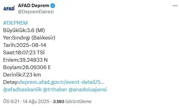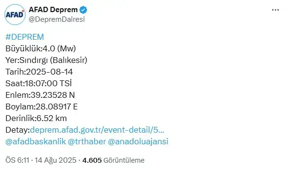 Balıkesir Sındırgı'da 4 ve 3.6 büyüklüğünde peş peşe iki deprem meydana geldi.