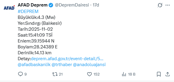 Balıkesir'in Sındırgı ilçesinde korkutan bir deprem daha meydana geldi. AFAD'ın son verilerine göre Sındırgı'da 4.3 büyüklüğünde bir sarsıntı meydana gelirken, 14.13 kilometre derinlikte oluşan sarsıntı çevre illerde de paniğe neden oldu.