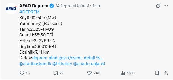 Afet ve Acil Durum Yönetimi Başkanlığı (AFAD), saat 11.58'de Balıkesir'in Sındırgı ilçesinde 4.5 büyüklüğünde deprem olduğunu duyurdu.