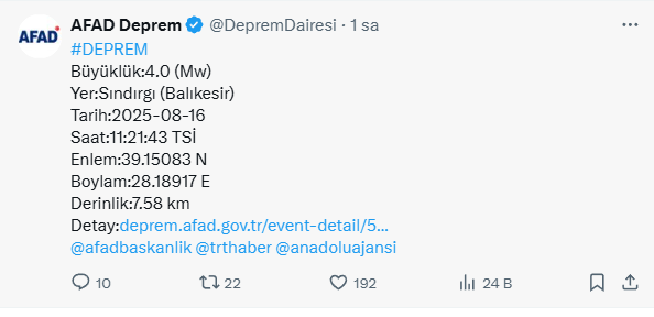 Afet ve Acil Durum Yönetimi Başkanlığı'ndan elde edilen verilere göre, merkez üssü Sındırgı'da 4.0'lük bir deprem yaşandı. Saat 11.21'de meydana gelen depremin derinliği 7.58 kilometre olarak kaydedildi.