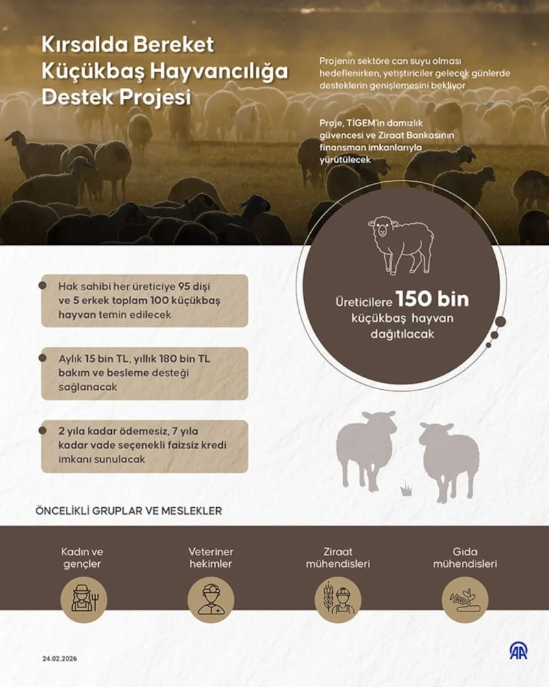 Yumaklı, 2026-2028 yıllarını kapsayan 3 yıllık program dahilinde, 150 bin küçükbaş hayvanın üreticilere uygun şartlarda verileceğine işaret ederek, genç ve kadın üreticiler, birinci derece tarımsal amaçlı örgüt üyeleri, engelliler, şehit yakınları ve gazilere öncelik tanıyacaklarını belirtti.