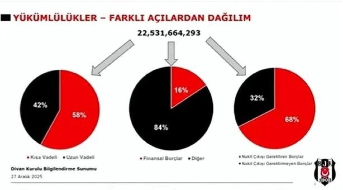 Beşiktaş Kulübü'nün toplam borcunun 31 Ağustos 2025 tarihi itibarıyla 22 milyar 531 milyon 664 bin 293 lira olduğu açıklandı.