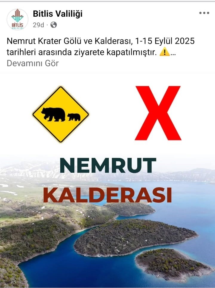 Bitlis valiliği sosyal medya hesaplarından yaptığı paylaşımda, "Nemrut Kalderasında bulunan ayılar yaban hayvanı ve yabanıl özellikleri devam eden yırtıcı bir türdür. Ziyaretçilerin iyilik adı altında bu yabani ve yırtıcı hayvanlara yiyecek vermeleri, elle beslemeleri sonucu ayıların beslenme alışkanlıkları olumsuz etkilenmiş ve besin ihtiyaçlarının büyük bir kısmını ziyaretçilerden temin etmeye başlamışlardır. Son günlerde yazılı ve görsel medyada görüldüğü üzere yaban hayvanı olan bir grup ayının alana giren ziyaretçilere saldırdığı gözlemlenmiştir. Bu saldırılar çok tehlikeli bir durum arz etmektedir. Her ne kadar alanın tamamında güvenlik önlemlerine yönelik uyarıcı tabelalar yerleştirilmiş, gerekli güvenlik tedbirleri İl Jandarma Komutanlığı ve Doğa Koruma ve Milli Parklar Bölge Müdürlüğü görevlileri tarafından alınmış olsa da alana gelen ziyaretçilerin bazılarının bu yaban hayvanına karşı kendi güvenliklerini tehlikeye düşürecek davranışlar sergiledikleri, uyarı ikaz tabelalarını dikkate almadıkları, ayıları elle beslemeye devam ettikleri ve ayılara yaklaştıkları görülmektedir. Bunun sonucunda ayılar ziyaretçilere saldırı girişiminde bulunmaktadır. Bu sebeplerle, Nemrut Kalderası Tabiat Anıtı’nda telafisi mümkün olmayan herhangi bir can ve mal kaybına neden olunmaması açısından mevzuat çerçevesinde gerekli tedbirleri almak üzere, ayıların beslenme alışkanlıklarını yeniden rehabilite etmek ve oluşabilecek can ve mal kaybının önüne geçmek adına Nemrut Kalderası tedbiren ve geçici olarak 1-15 Eylül 2025 tarihleri arasında Doğa Koruma ve Milli Parklar 14. Bölge Müdürlüğünün talebi doğrultusunda ziyarete kapatılmıştır" ifadelerine yer verildi.