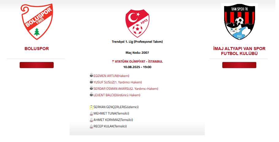 Trendyol 1.Lig’de futbol heyecanı başlıyor… Uzun yıllar sonra çıktığı 1.Lig’de başarı hedefleyen Vanspor, Pazar günü Trendyol 1.Lig’in ilk haftasında İstanbul Atatürk Olimpiyat Stadında Boluspor’a konuk olacak. TFF, Süper Lig ve 1.Lig’de oynanacak olan ilk hafta maçlarında düdük çalacak hakemler açıklanırken Boluspor-Vanspor maçını yönetecek hakemler belli oldu.