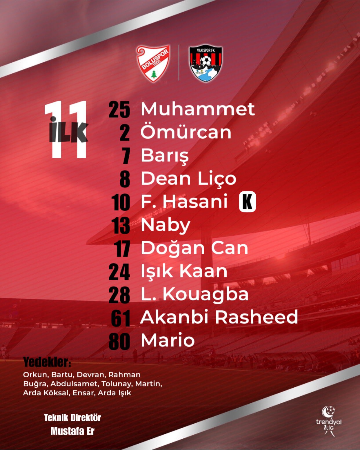 Trendyol 1.Lig’de ligin ilk hafta maçında Boluspor ile Vanspor, karşı karşıya gelecek. Futbolseverlerin özlemle beklediği yeni sezon heyecanı başlarken maçı izlemek isteyen taraftarlar ise heyecanla bekliyor. Bu heyecanlı maçta oynayacak ilk 11 oyuncu ise belli oldu. İşte ilk 11’ler...