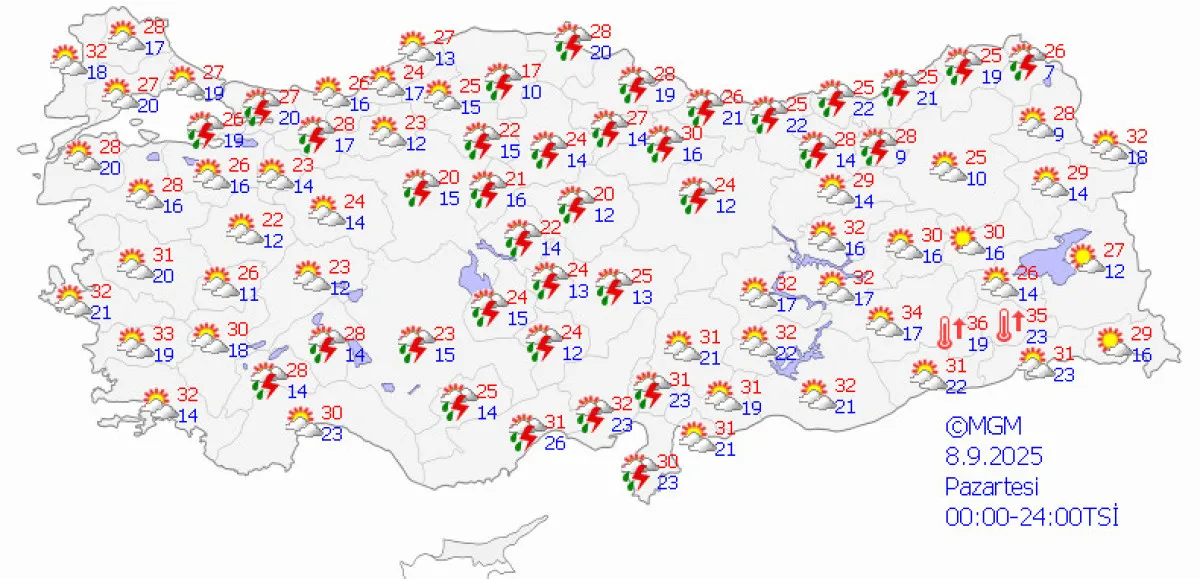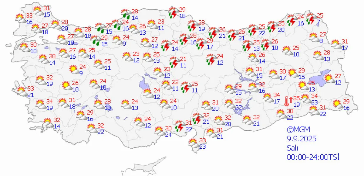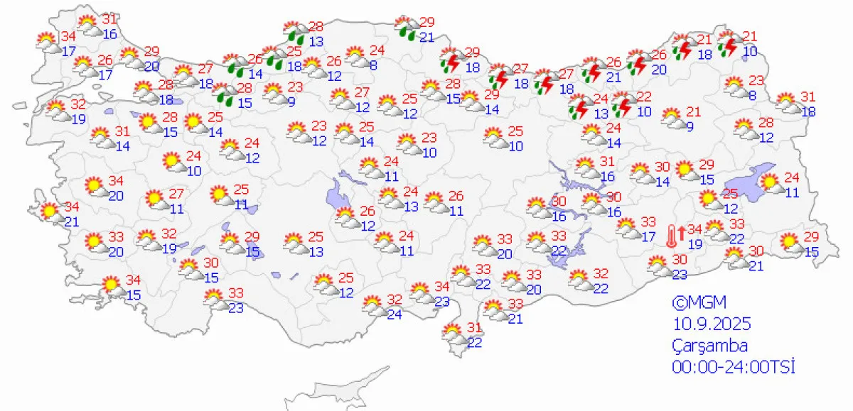 Meteorolojik verilere göre, yurdun büyük bölümünde sağanak yağışların devam etmesi bekleniyor. Meteoroloji Genel Müdürlüğü, son hava durumu raporunu duyurdu. Buna göre sıcaklıklar kademe kademe yurt genelinde azalmaya ve mevsim normallerine dönmeye devam edecek. Son tahminlerine göre; yağışların Doğu Karadeniz kıyıları ile Afyonkarahisar, Karabük Çankırı, Kastamonu çevreleri ve Ankara'nın güney ilçelerinde kuvvetli olması bekleniyor.