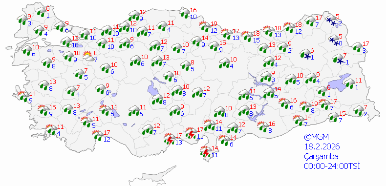 Meteoroloji Genel Müdürlüğü (MGM), ülke genelinde hava sıcaklıklarında Çarşamba günü itibarıyla hızla düşüş yaşanacak. 5 günlük hava tahmin raporuna göre; 18 Şubat Çarşamba günü için 81 ilin tamamında yağmur ve kar beklenirken, 18 Şubat Çarşamba 14 ilde ise kar yağışı görülebileceği uyarısında bulundu.
