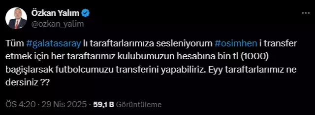 Yalım, sosyal medya hesabından Osimhen hakkında dikkat çeken bir paylaşım yaptı. X hesabından bir paylaşım yapan Yalım, "Tüm Galatasaraylı taraftarlarımıza sesleniyorum. Osimhen'i transfer etmek için her taraftarımız kulübümüzün hesabına bin TL (1000) bağışlarsak futbolcumuzun transferini yapabiliriz. Eyy taraftarlarımız ne dersiniz?" ifadelerini kullandı. Yalım'ın bu paylaşımı, kısa sürede sosyal medyada geniş yankı uyandırarak gündeme oturdu.