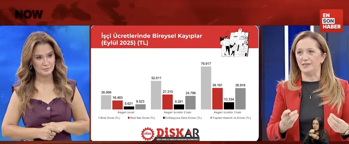 NOW TV canlı yayınına katılan Çerkezoğlu, Türkiye’de asgari ücretin artık ortalama ücret haline geldiğini söyledi. Dört kişilik bir ailenin tüm fertleri çalışsa dahi gelirlerinin yoksulluk sınırını geçemediğini vurgulayan DİSK Başkanı, bu tablonun kabul edilemez olduğunu ifade ederek, "Asgari ücret, işçinin ailesiyle birlikte insanca yaşayabileceği düzeyde belirlenmelidir." dedi.