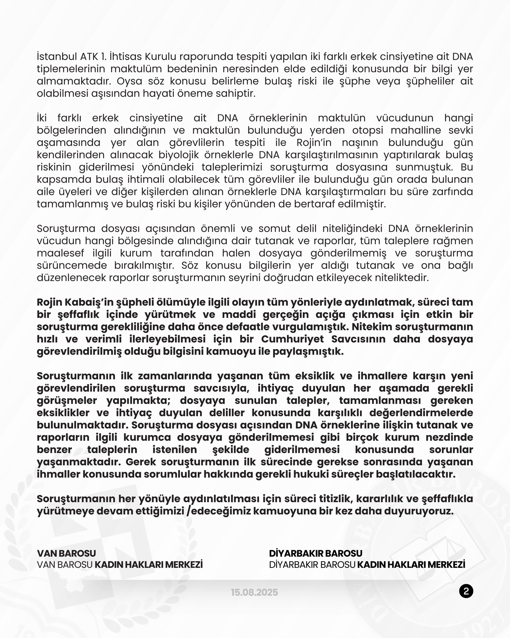 Açıklamada, "27.09.2024 tarihinde Van Yüzüncü Yıl Üniversitesi’nde bulunan KYK yurdundan akşam saatlerinde ayrıldıktan sonra kendisinden bir daha haber alınamayan ve 18 gün sonra cansız bedenine ulaşılan Rojin Kabaiş’in şüpheli ölümünün aydınlatılması için Van Cumhuriyet Başsavcılığınca yürütülen soruşturma dosyası tarafımızca titizlikle takip edilmektedir.