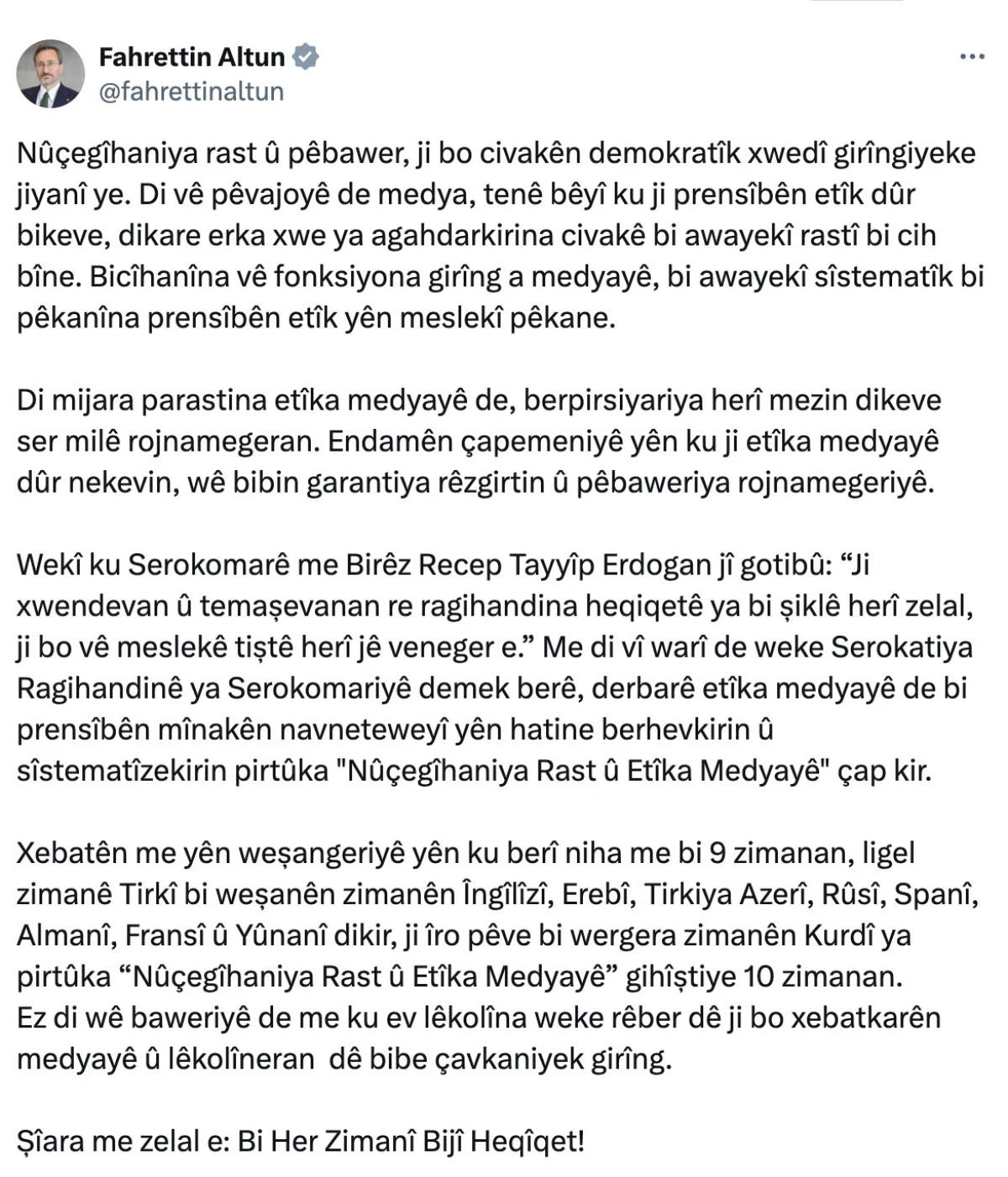 FAHRETTİN ALTUN'UN KÜRTÇE PAYLAŞIMI İSE ŞU ŞEKİLDE: