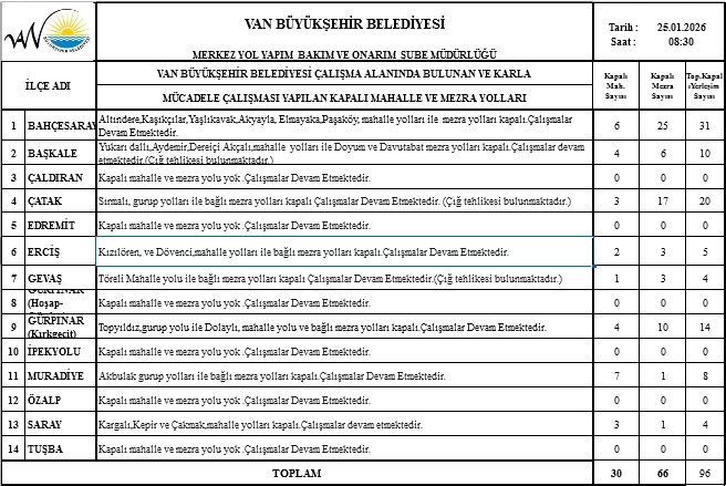 Belediyeden yapılan açıklamaya göre, 25 Ocak 2026 tarihi itibarıyla Van genelinde 30 mahalle yolu ve 66 mezra yolu olmak üzere toplam 96 yerleşim yerinin yolu ulaşıma kapalı bulunuyor. Özellikle kırsal ve yüksek rakımlı ilçelerde kar kalınlığının artmasıyla birlikte kapanan yol sayısının yükseldiği belirtildi.