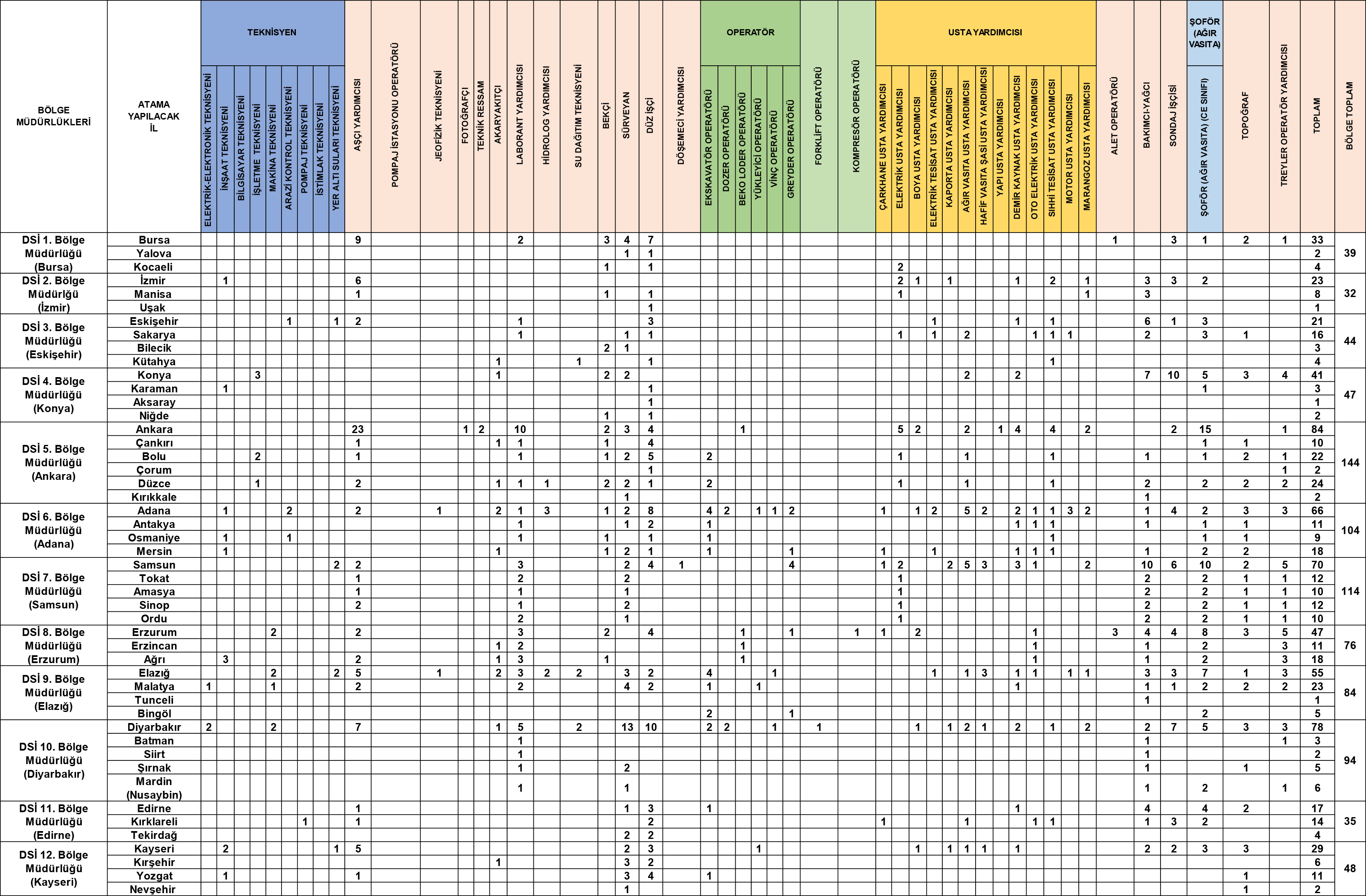 Tarım ve Orman Bakanı İbrahim Yumaklı’nın açıklamasına göre alınacak personellerin kontenjan dağılımı belli oldu: 210 usta yardımcısı,154 aşçı yardımcısı, 154 şoför, 140 düz işçi, 116 bakımcı-yağcı, 105 sürveyan, 69 sondaj işçisi, 66 treyler operatör yardımcısı, 64 laborant yardımcısı, 59 teknisyen, 58 topoğraf, 44 bekçi, 19 su dağıtım teknisyeni, 15 akaryakıtçı, 13 hidrolog yardımcısı, 7 jeofizik teknisyeni, 5 alet operatörü, 2 teknik ressam, 2 pompaj istasyonu operatörü ve birer döşemeci yardımcısı, fotoğrafçı ve kompresör operatörü olmak üzere 1305 işçi alınacak. Ayrıca Ekskavatör, Dozer, Beko Loder, Yükleyici, Vinç, Greyder ve Forklift Operatörü kadroları olmak üzere toplam 84 operatör, uygulamalı sınav yöntemi ile alınacak.
