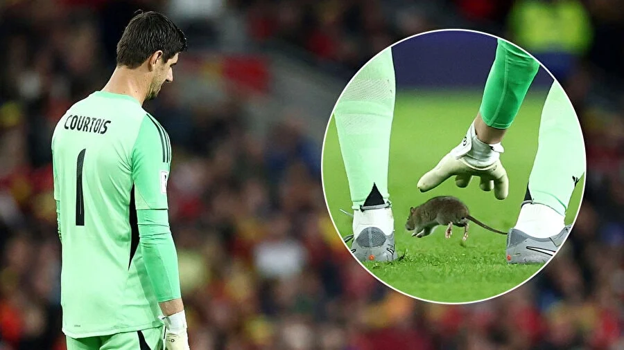 Real Madrid ve Belçika Milli Takımı’nın yıldız kalecisi Thibaut Courtois, bu kez topu değil, sahaya aniden giren bir fareyi yakalamaya çalıştı.