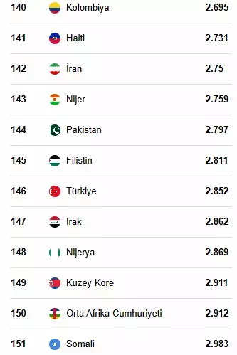 Türkiye, 163 ülke arasında 146. sırada kendine yer buldu. 2025 raporuna göre Türkiye'nin huzur puanı 2.852 olarak ölçüldü. Geçen yıla kıyasla puanın daha da kötüleştiği görülürken, Türkiye bölgesel kategoride ise "Doğu Avrupa ve Orta Asya" grubunda 13. sırada yer aldı.