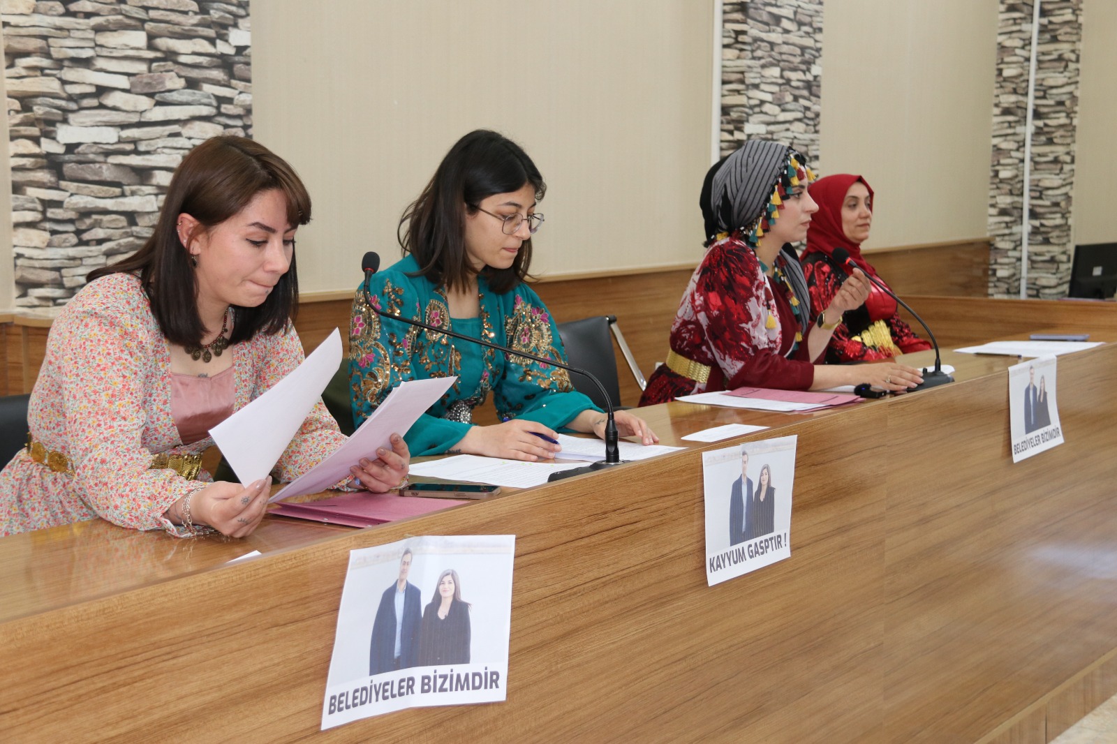 Gündem maddelerine geçilmeden önce konuşan Eşbaşkan Koç, kadın cinayetlerine dikkat çekti. Koç, “8 Mart dünyanın dört bir yanında her dilden, her renkten kadınlar olarak bu isyanı dalga dalga büyütüyoruz. Eşit, özgür, savaşsız, sömürüsüz bir dünyayı örme yolunda umutla ve güçlü adımlarla yürüyoruz. İktidarlar, kadınların haklarına yaşamlarına bedenlerine ve emeklerine olan saldırılarını her geçen gün arttırıyor. Kadına yönelik şiddet önlenemiyor. Her gün kadınlar katledilirken cezasızlık politikalarıyla bu katliamlar normalleştiriliyor, meşrulaştırılıyor. “ diye konuştu.