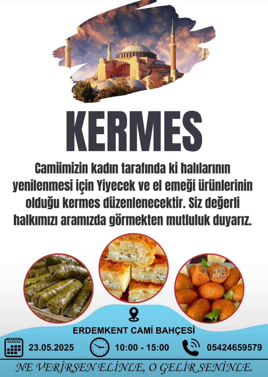 Erdemkent Camii kadın cemaatinin öncülüğünde anlamlı bir dayanışma etkinliği düzenleniyor. Camii kadın bölümündeki halıların yenilenmesi amacıyla gerçekleştirilecek kermeste, ev yapımı yiyecekler ve el emeği ürünler satışa sunulacak. Hem ihtiyaçlara katkı sunmak hem de birlikteliği pekiştirmek amacıyla düzenlenen kermese tüm vatandaşlar davet edildi.