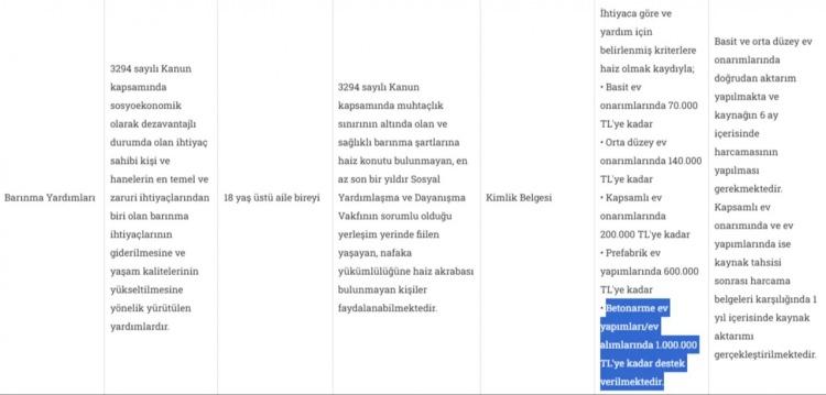Sosyal devlet anlayışı kapsamında vatandaşlara birçok destek yapılıyor. Aile e Sosyal Hizmetler Bakanlığı'nın sosyal yardım programlarında 2 önemli destek bulunuyor. Bu destekler ev alacak ve ev yaptıracak kişileri yakından ilgilendiriyor. Barınma Yardımları" ve "Eşi Vefat Etmiş Kadınlara Yönelik Konut Destek Programı" kapsamında ev alacaklara ya da ev yaptıracaklara 1 milyon liraya kadar destek sağlanıyor.
