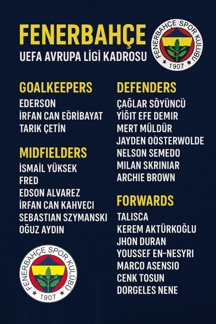 Trendyol Süper Lig'de geçtiğimiz sezonu şampiyon Galatasaray’ın ardın ikinci tamamlayarak Şampiyonlar Ligi’nde lig etabına kalmak için iki ön eleme oynamış ve bu elemeler sonucunda elenerek Avrupa Ligi’nde mücadele etme hakkı kazandı. UEFA’nın Şampiyonlar Ligi ve Avrupa Ligi’nde yer alan takımlar için kadro bildirim süresi dolarken Fenerbahçe'nin UEFA Avrupa Ligi kadrosu belli oldu.